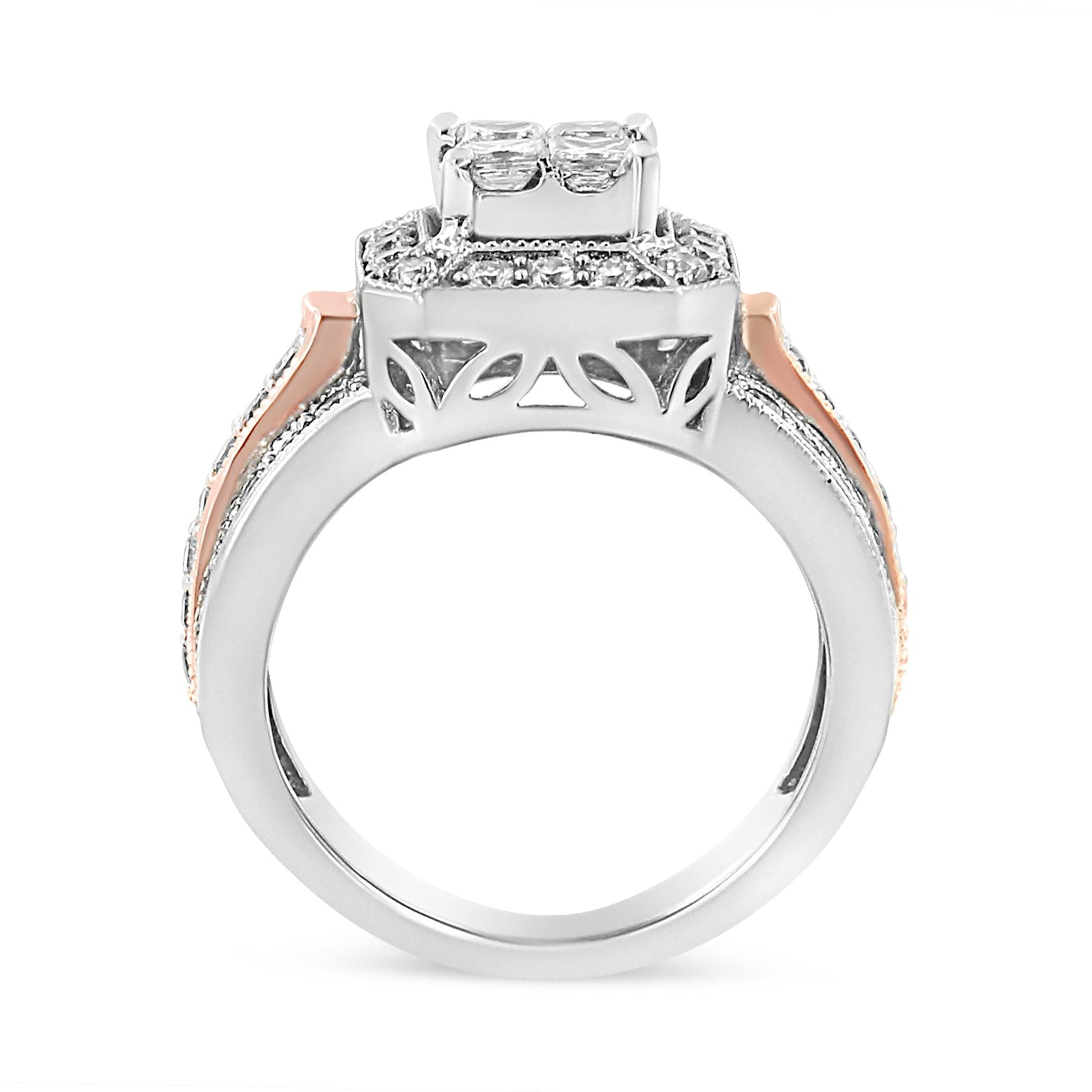 This intricately designed cocktail ring has a composite design that shines with 1 1/8 cttw of natural diamonds. A cluster of 4 princess-cut diamonds sits at the center of this piece, and is flanked by a separated halo of round-cut diamonds. The 14k white gold band has a streak of rose-gold going through the center. Round-cut diamonds embellish the band as well for an extra dazzling effect. This cluster ring will look magnificent on your fingers.